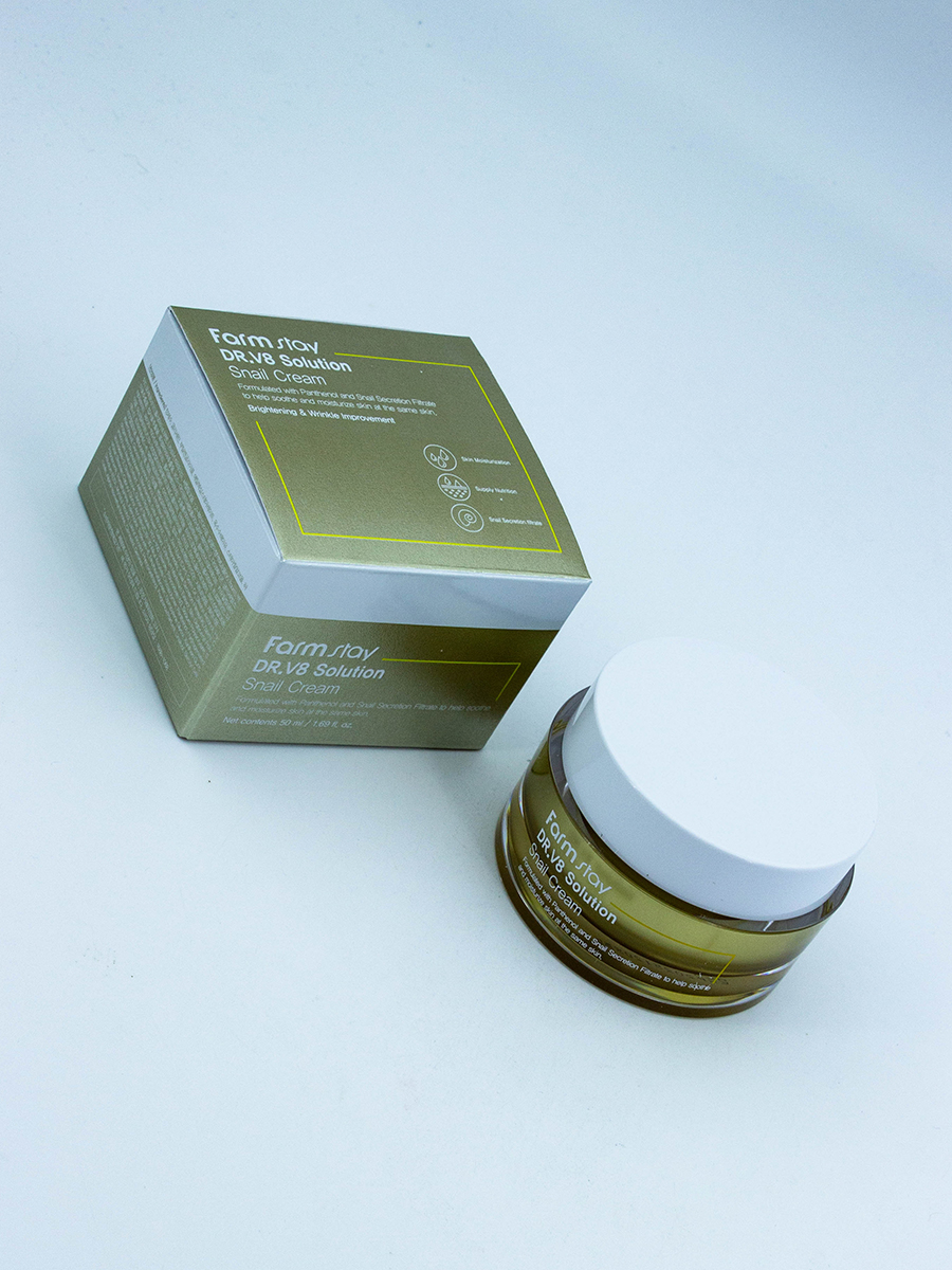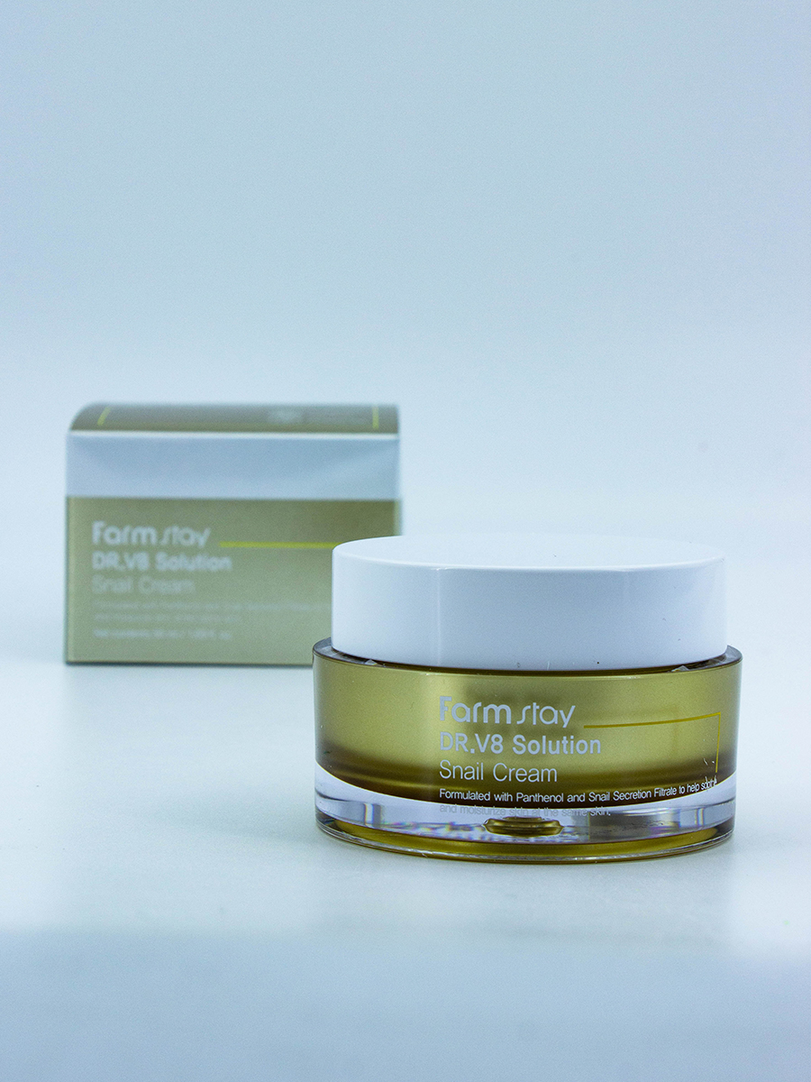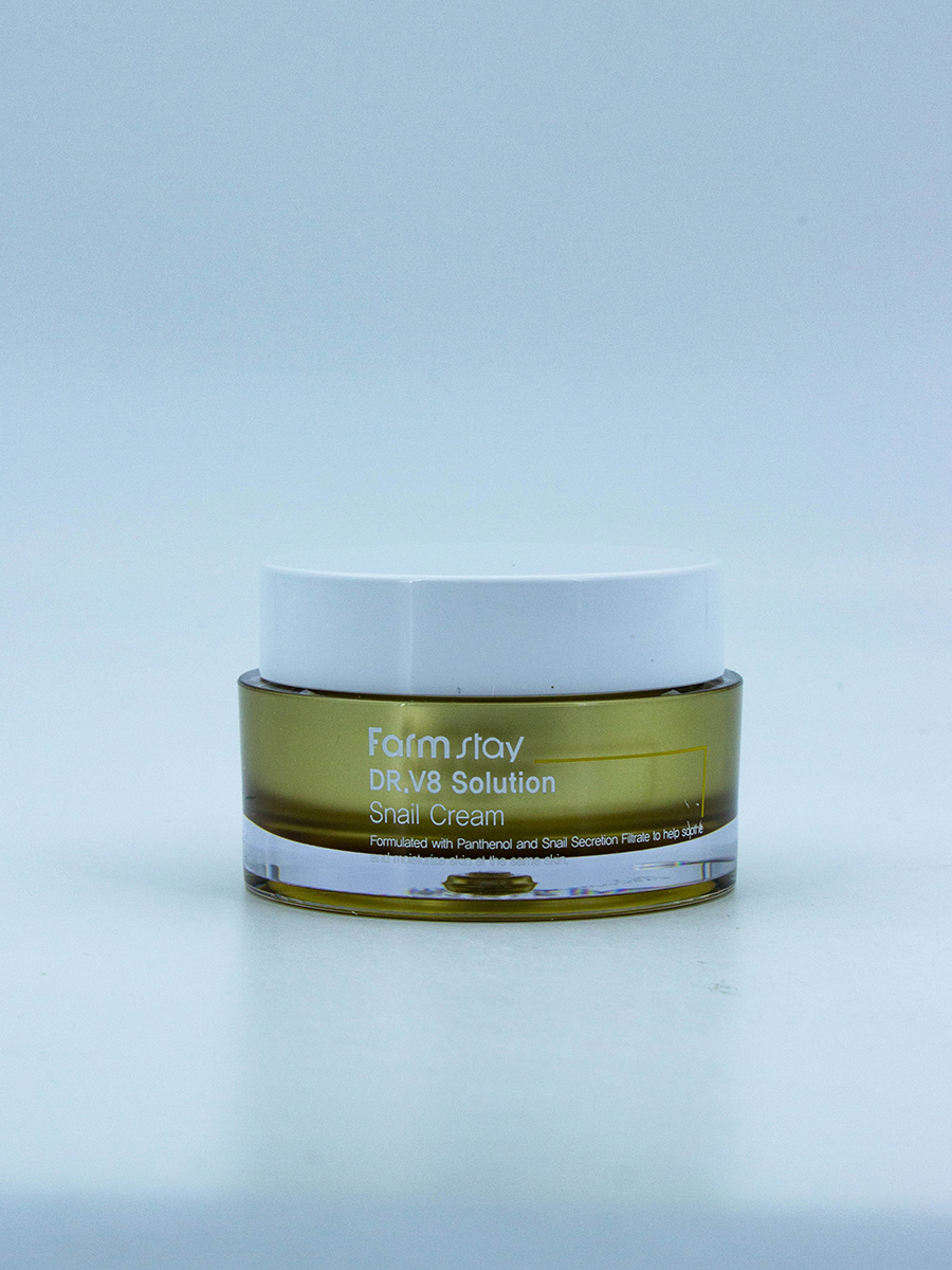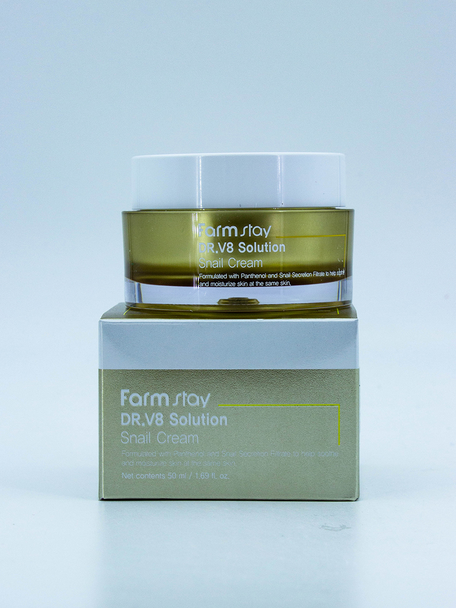 Крем для лица серии FarmStay DR.V8 Solution с муцином улитки содержит пантенол, который помогает успокоить раздраженную кожу, и фильтрат улиточного муцина, который обеспечивает коже дополнительное увлажнение, тем самым делая ее максиьально увлажненной и свободной от раздражений одновременно.